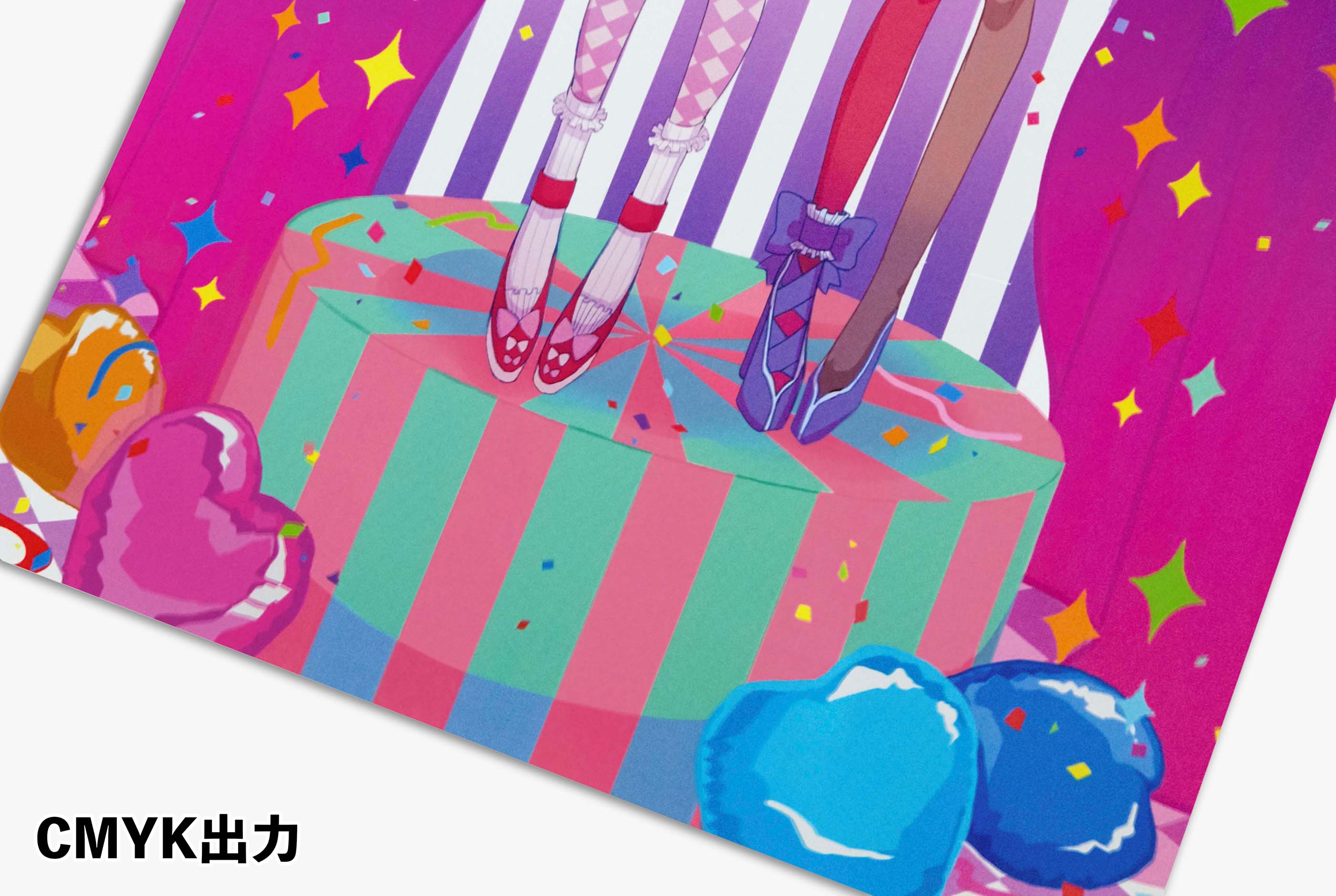 同じRGBデータを、「通常CMYK出力」と「CMYK(ピンク入り5色印刷)」の2種で出力した結果です。